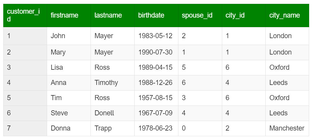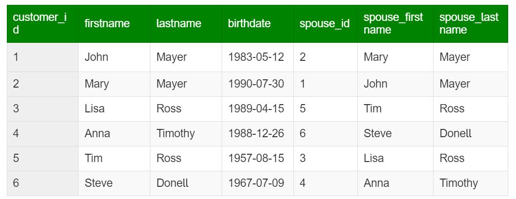 ์ฐ๋ฆฌ๊ฐ ์ถ๊ฐ์ ์ผ๋ก ํ์ํ ์ ๋ณด๋ ๋ฐฐ์ฐ์์ ์ฑ๊ณผ ์ด๋ฆ์ ๋๋ค. ๊ทผ๋ฐ ํด๋น ์ ๋ณด๋ ๋ฐ๋ก ๊ฐ์ ํ ์ด๋ธ ์์ customer_id ๋ก ์ ์ฅ์ด ๋์ด ์์ต๋๋ค. spouse_id ๊ฐ customer ํ ์ด๋ธ ๋ด์ ๋ค๋ฅธ ๊ณ ๊ฐ์ ์์ด๋, ์ฆ customer_id๋ฅผ ์๋ฏธํ๊ธฐ ๋๋ฌธ์ ์ฐ๋ฆฌ๋ ์ด๋ฅผ ์ค์ฌ์ผ๋ก ํ ์ด๋ธ์ ํฉ์ณ์ค ๊ฒ์ ๋๋ค.