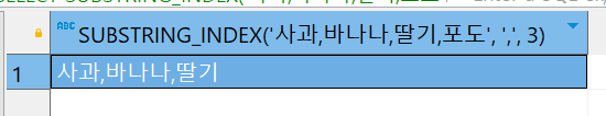 SELECT SUBSTRING_INDEX('사과,바나나,딸기,포도', ',', 3);
