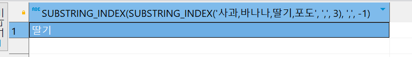 SELECT SUBSTRING_INDEX(SUBSTRING_INDEX('사과,바나나,딸기,포도', ',', 3), ',', -1)