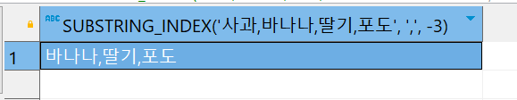 SELECT SUBSTRING_INDEX('사과,바나나,딸기,포도', ',', -3);