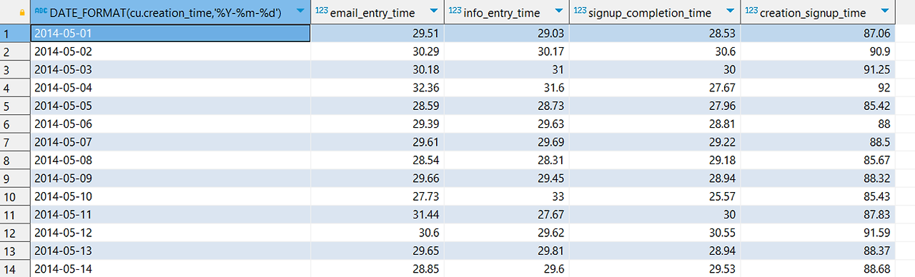 round(avg(timestampdiff(SECOND, ei.info_time, cs.signup_time)),2) AS signup_completion_time,