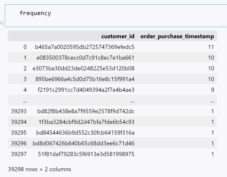 frequency = olist_df.groupby('customer_id')['order_purchase_timestamp'].nunique().sort_values(ascending=False).reset_index()