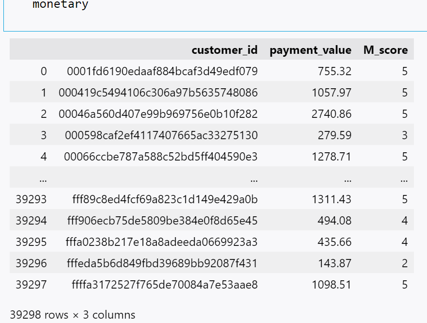 monetary['M_score'] = pd.qcut(monetary['payment_value'], 5, labels=[1,2,3,4,5])