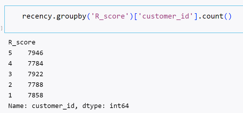 recency['R_score'] = pd.qcut(recency['diff_date'], 5, labels=[5,4,3,2,1])