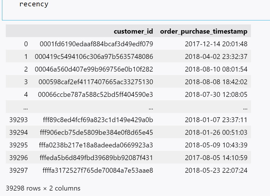 recency = olist_df.groupby('customer_id')['order_purchase_timestamp'].max().reset_index()