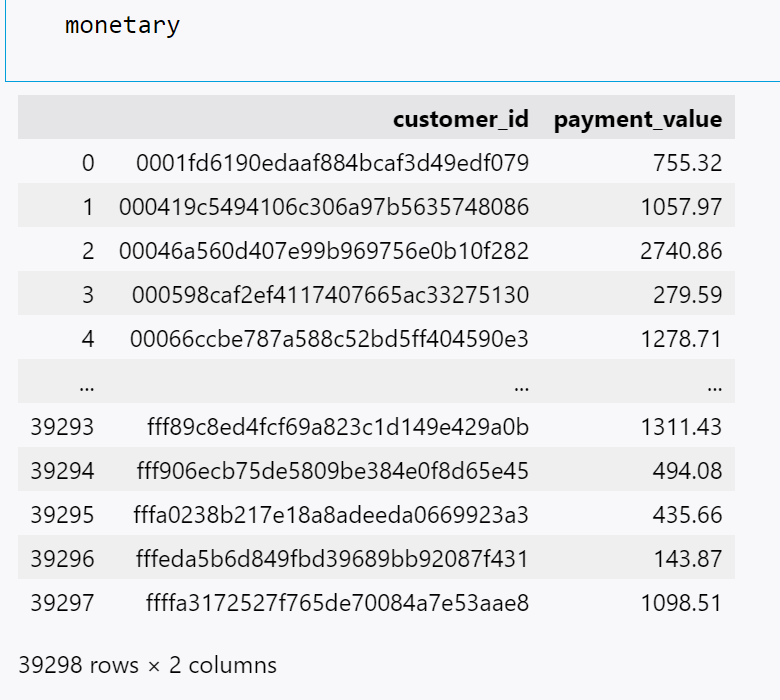 monetary = olist_df.groupby('customer_id')['payment_value'].sum().reset_index()