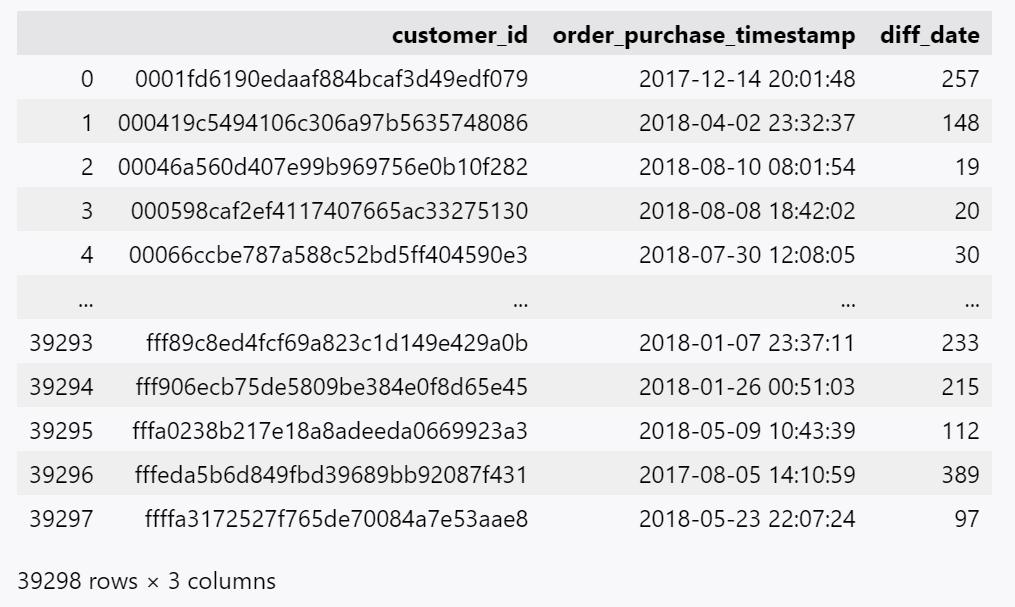 recency['diff_date'] = (max_date - recency['order_purchase_timestamp']).dt.days