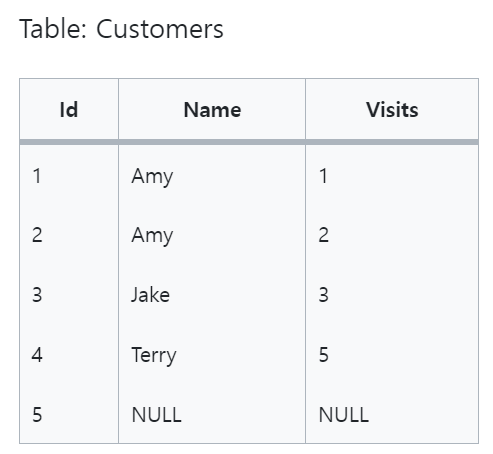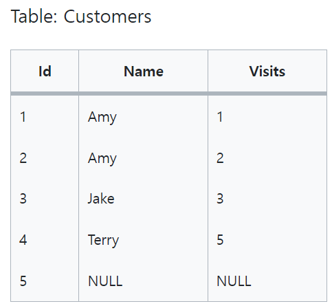 INSERT INTO Customers(Id, Name, Visits) values(1, "Amy", 1), (2, "Amy", 2), (3, "Jake", 3), (4, "Terry", 5), (5, NULL, NULL);