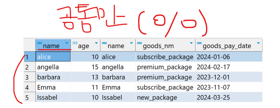 2) ๊ตฌ์ฑ์ด ๋ค๋ฅด์ง๋ง ํน์ ์ปฌ๋ผ์ ๊ณตํต ์ปฌ๋ผ์ผ๋ก ๊ฐ์ ธ์ฌ๋
